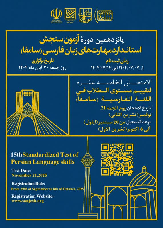 پانزدهمین دوره آزمون سنجش استاندارد مهارت‌های زبان فارسی (سامفا) در روز جمعه 30 آبان‌ماه 1404 برابر با 21 نوامبر 2025 برگزار خواهد شد.
